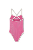 Perfect for beach adventures, this charming one-piece swimsuit brings vintage-inspired style to little ones' summer days. The square neckline and low back create a flattering silhouette, while crossover fixed straps ensure secure, comfortable wear. Retro contrast rib binds add playful character to the shell pink design. Ideal for confident swimmers heading to the pool or ocean.