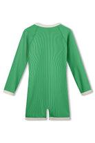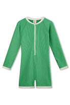 Perfect for beach adventures, this vibrant parrot green rashie combines style with practical sun safety. The long-sleeve design and crew neckline offer excellent UV protection, while the short-length brief keeps your little one comfortable in and out of the water. Contrast ribbed binding adds durability and a polished finish, and the convenient front zip makes getting changed effortless. An essential piece for active water play.